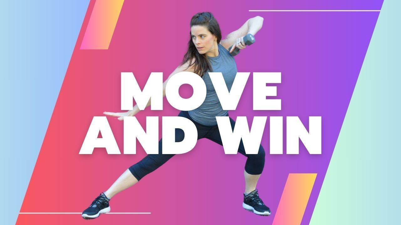 Full access to the Move and Win workout library, which is categorized into Strength, Cardio, Kickboxing, Recovery, Small Wins (express workouts), and Menopause/Perimenopause.